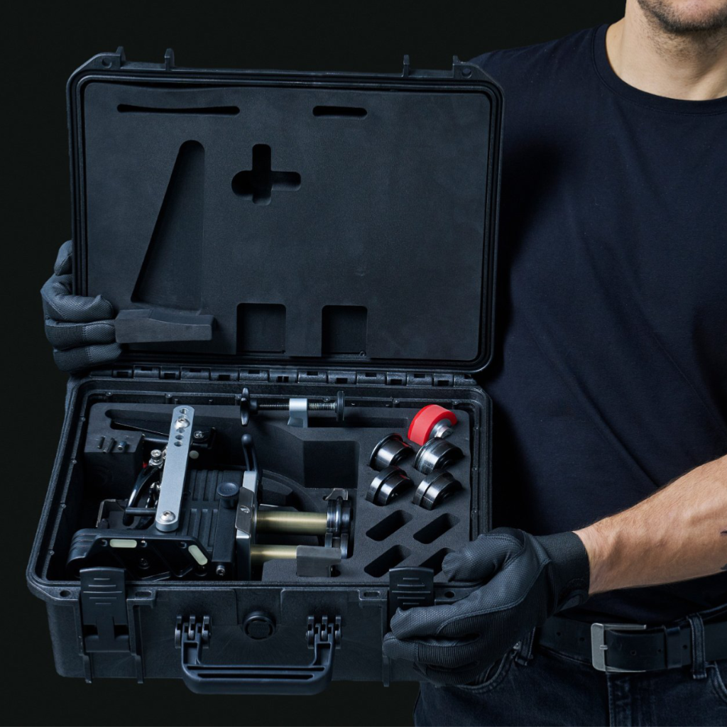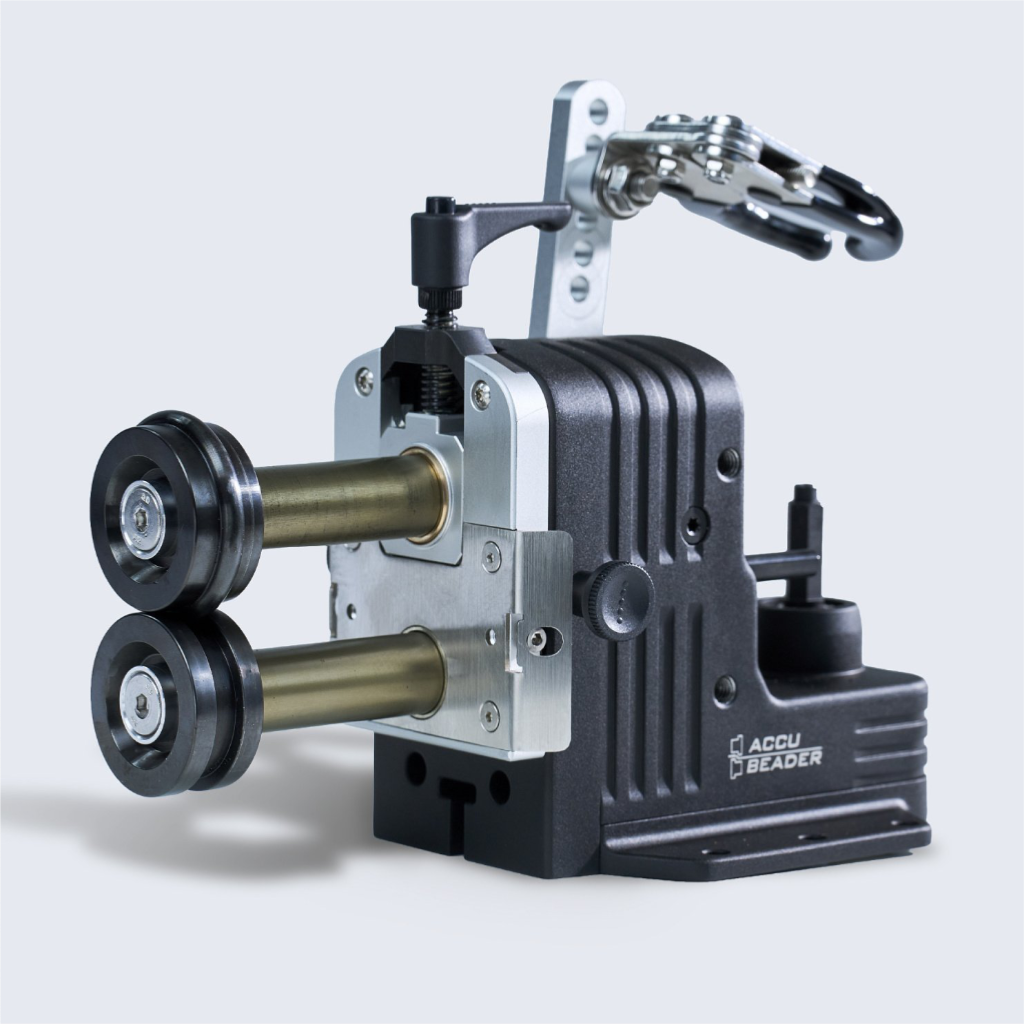 Accubeader Drill Powered Beading Machine. The New Buschmann Tools Accubeader produces various bead types in metal pipes and sheet metal. Cordless drill powered, it can be operated with a pedal to keep both your hand free or handheld to keep you flexible anywhere. As a handheld tool, it provides fast operation or fixed to the work bench by quick clamp for highest control.